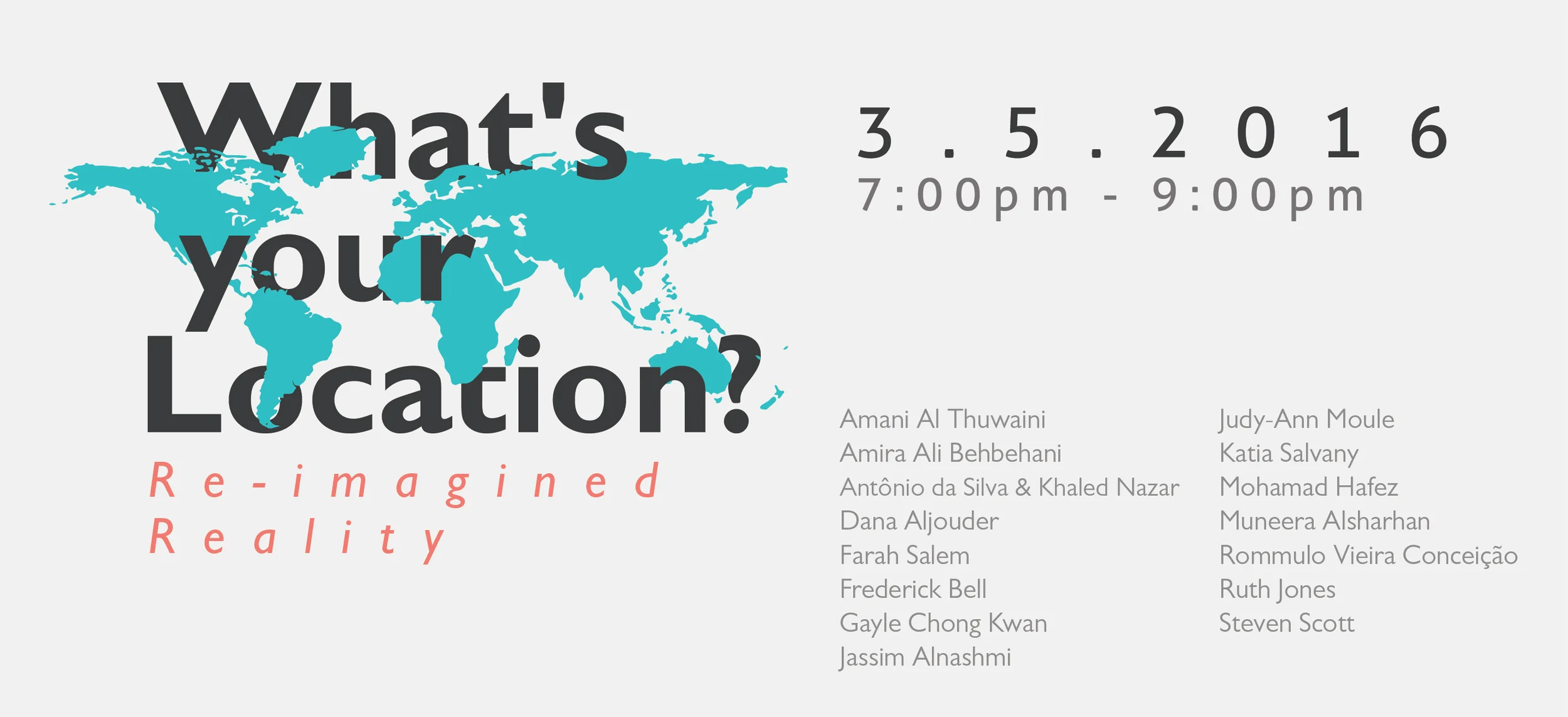 Participating artists: Amani AlThuwaini, Amira Ali Behbehni, Antonio Da Silva, Dana Aljouder, Farah Salem, Frederick Bell, Gayle Chong Kwan, Jassim Alnashmi, Judy-Ann Moule, Katia Salvany, Khaled Nazar, Mohamad Hafez, Muneera Alsharhan, Rommulo Vieira Conceição, Ruth Jones, Steven Scott.